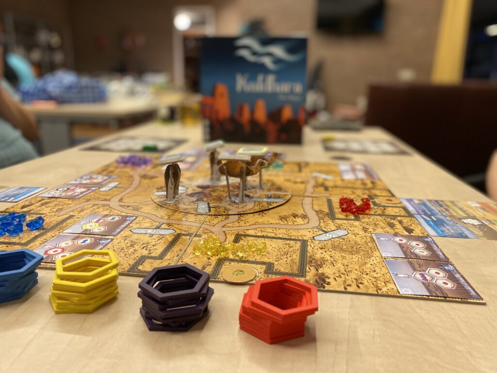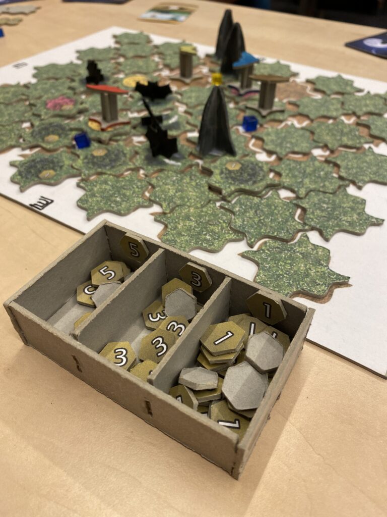 Het artwork was nu nog volledig van karton en hier en daar met stift gekleurd, maar dat gaf het spel vooral charme: je zit echt iets unieks te spelen! Desondanks zag het er al heel gaaf uit met een deck waar echt over nagedacht is qua indeling: doosjes waar alle kaarten en pionnen in bewaard worden passen precies in en bij elkaar, waardoor een spel dat er op tafel best groot uitziet, toch heel compact kan worden meegenomen.