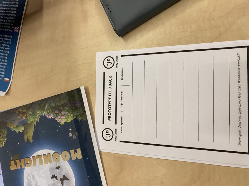 Als laatste was er Moonlight, een strategisch spel over nachtvlinders. Alle 3 zijn gloednieuw en nu in prototype gespeeld om de maker(s) te helpen de best mogelijke versie op de markt te brengen. Dat vergt behoorlijk wat herspelen en daar helpen we graag bij…