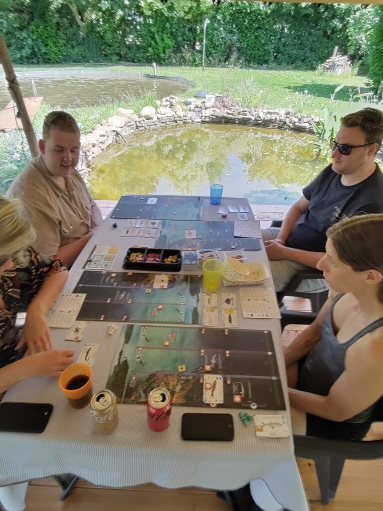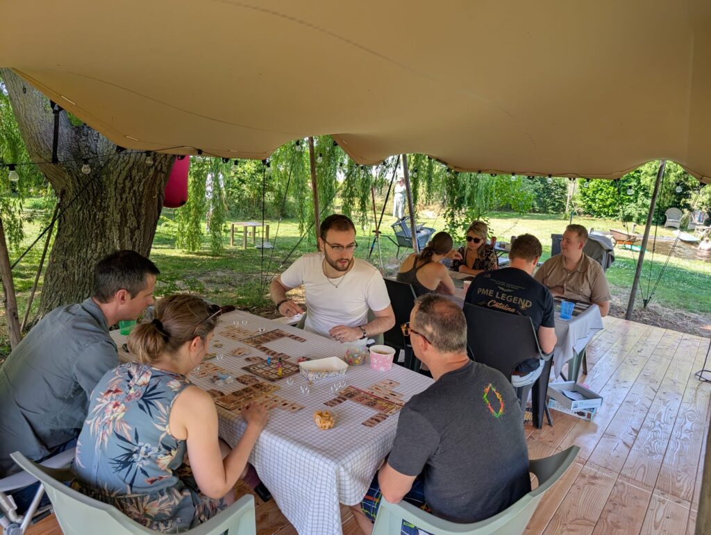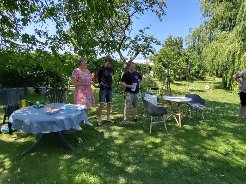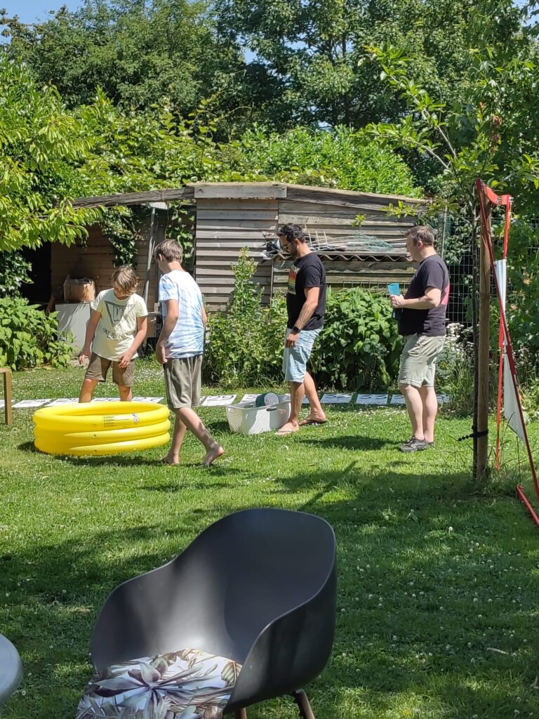 In de prachtige achtertuin van Jan was er ruimte in overvloed. Zo konden er op verschillende plekken tafels neergezet worden om spellen te spelen. Onder de veranda, onder de grote bomen en ook midden in de tuin op de nieuwe vlonder (onder een tarp). Het was wel nodig om ergens onder te zitten, in de schaduw want het was wel een heel warme dag🥵. Om af te koelen was er de mogelijkheid om af te koelen in de enorme zwemvijver achterin de tuin.