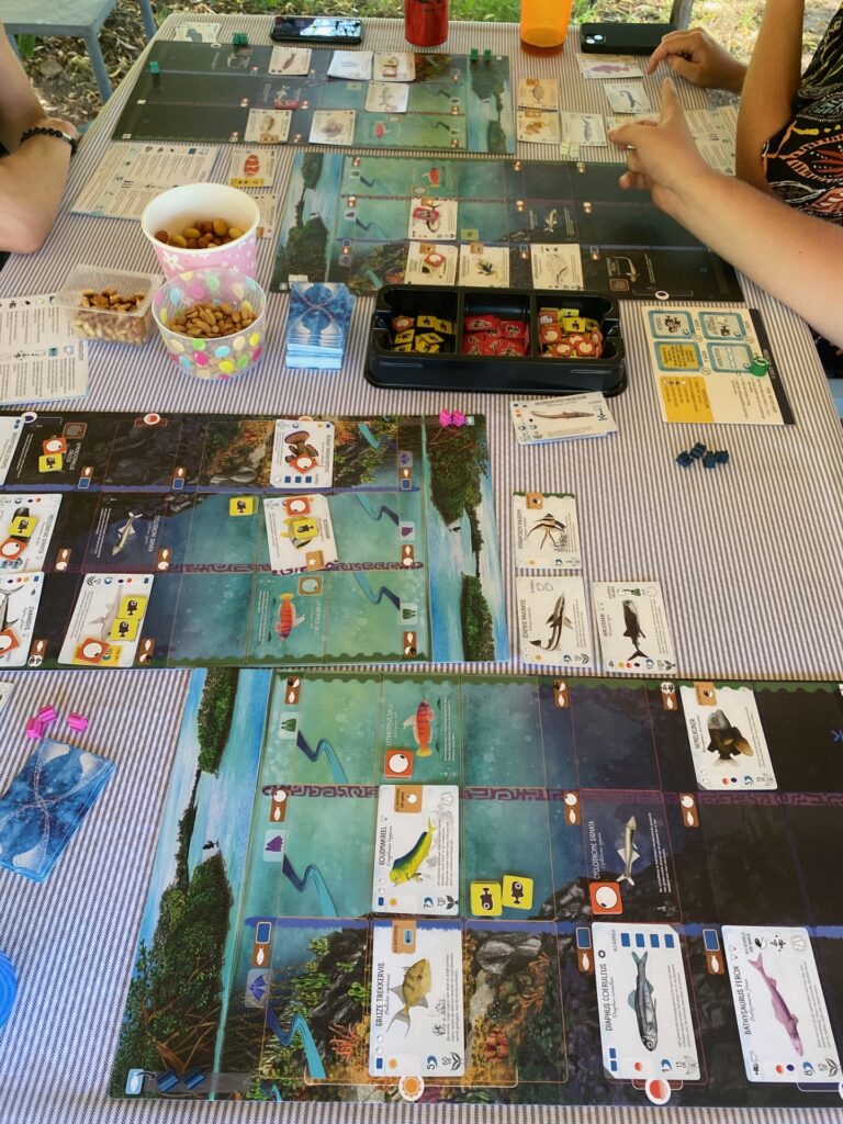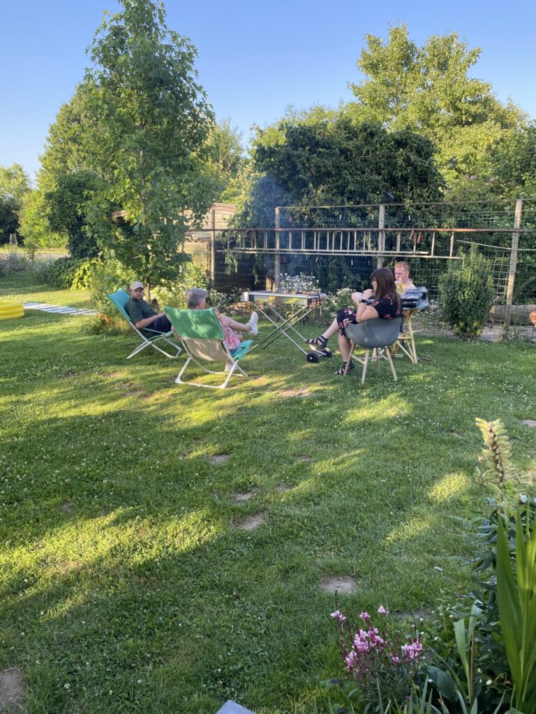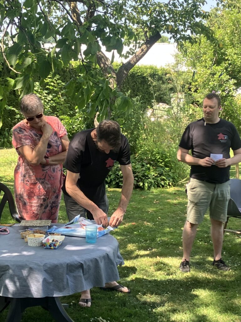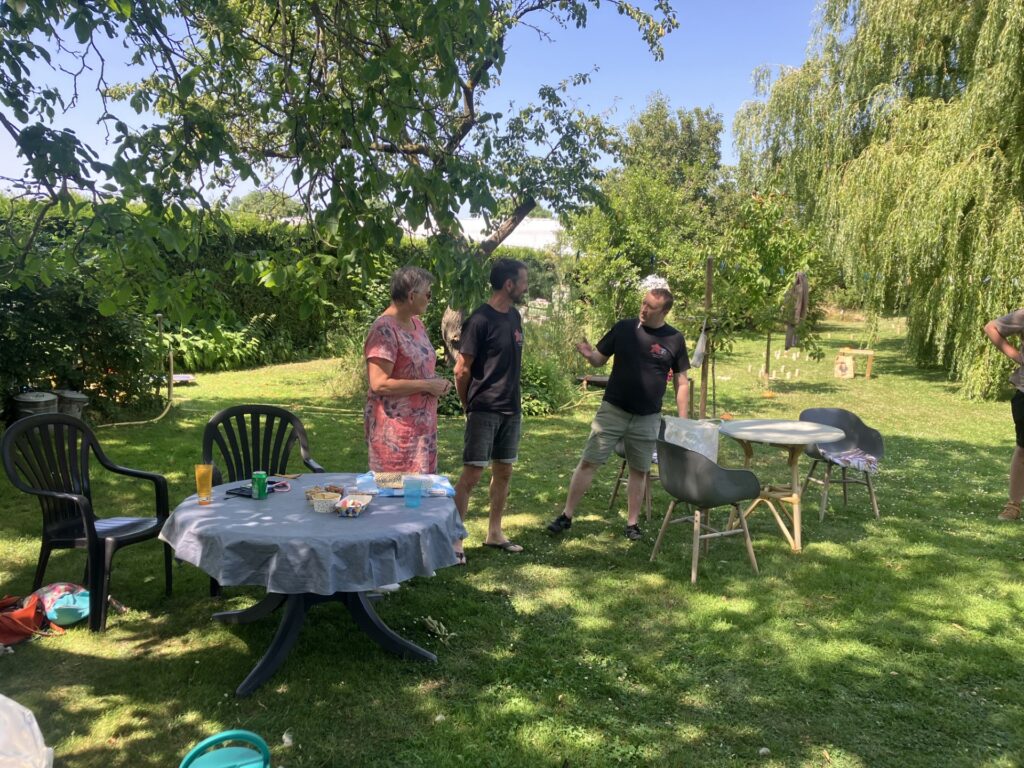 In de prachtige achtertuin van Jan was er ruimte in overvloed. Zo konden er op verschillende plekken tafels neergezet worden om spellen te spelen. Onder de veranda, onder de grote bomen en ook midden in de tuin op de nieuwe vlonder (onder een tarp). Het was wel nodig om ergens onder te zitten, in de schaduw want het was wel een heel warme dag🥵. Om af te koelen was er de mogelijkheid om af te koelen in de enorme zwemvijver achterin de tuin.