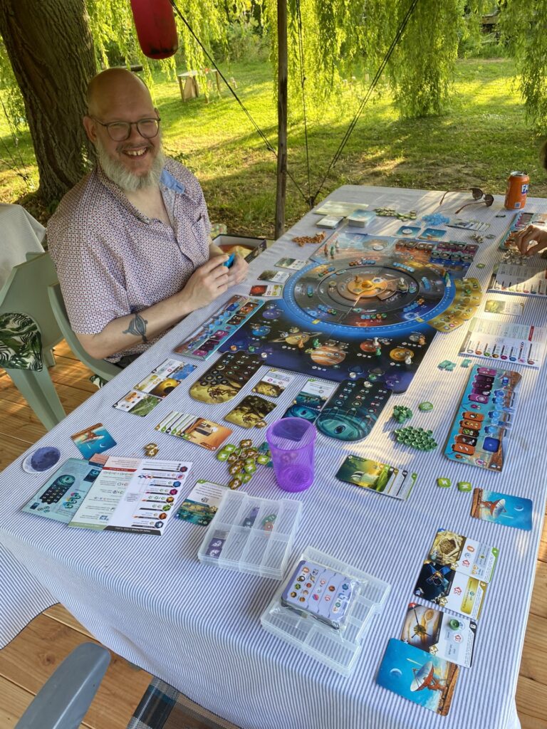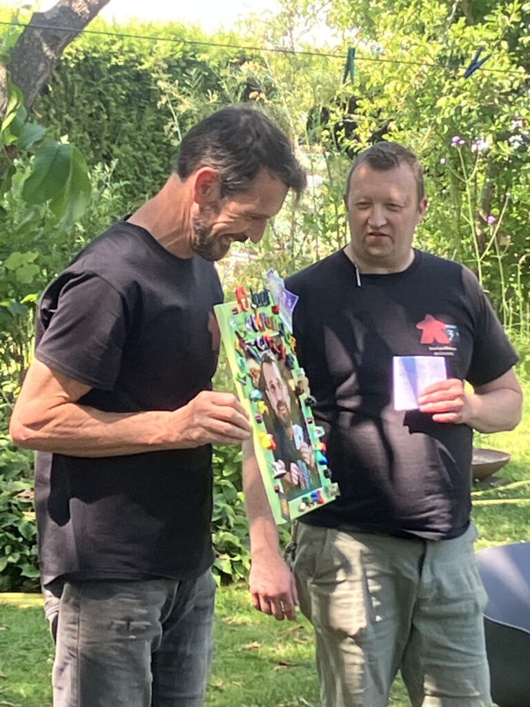 Tussen alle spellen door was er even een moment voor een “officieel gedeelte”. Jan moest natuurlijk even in het zonnetje gezet worden voor het niet alleen starten van de Bordspelfanaat, maar ook zich blijven inzetten voor de ontwikkeling er van. Daarnaast was er ook een bedankje richting Jan en Ans (zijn vrouw) voor het mogen gebruiken van hun tuin en alles daaromheen.